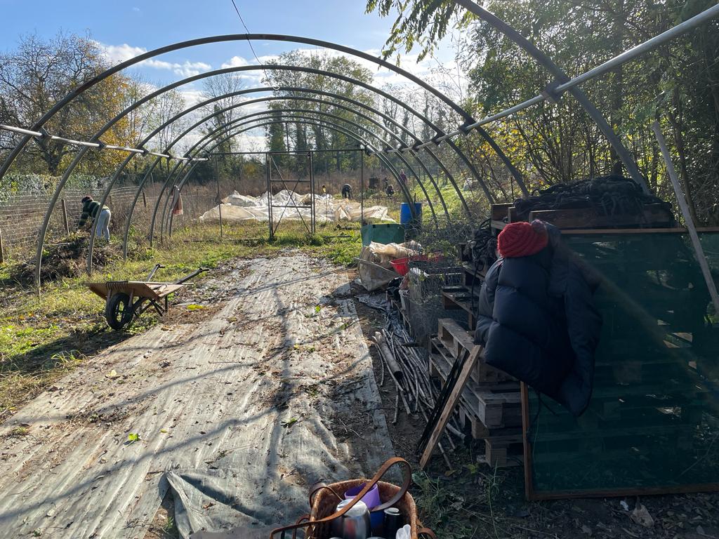 Chantier de nettoyage : retrait de la bâche de la serre, rangement des palettes, évacuation du mobilier inutilisable, organisation du matériel de culture, rangement des outils dans le cabanon, évacuation des déchets, vérification de l’utilisabilité du petit terrain de détente,…