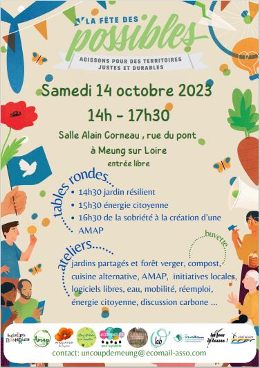 Un coup de Meung pour la planète, Le lab’O (centre social de Beaugency), Cléry en transition, Les Ateliers Ligétériens (la ressourcerie), De la graine aux fruits, Le Coquelicot, le Réseau des AMAPs Centre Val de Loire, les groupes du programme Life LetsGo4Climate, Le Pays Loire Beauce et Les fous de Bassan s’associent pour organiser la « Fête des possibles » !